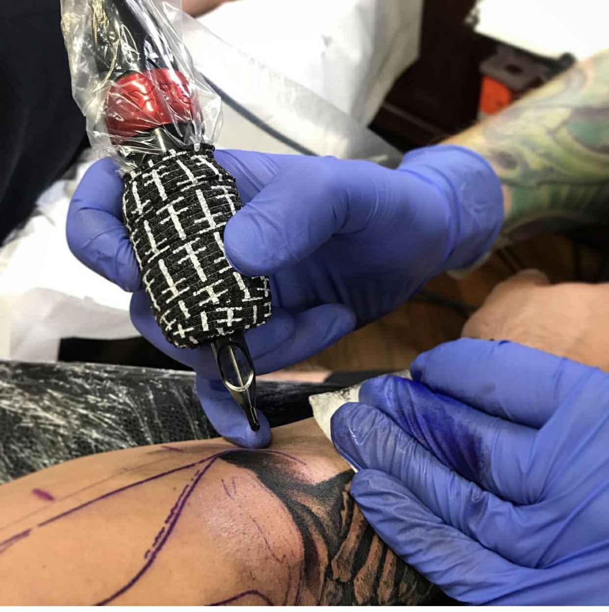 Таспалы таспа машинада да, жаңа татуировканы ластанудан қорғайды. Ол уақыт өткен сайын жиналатын қалдық пигменттер мен сұйықтықтардан тазартады.
